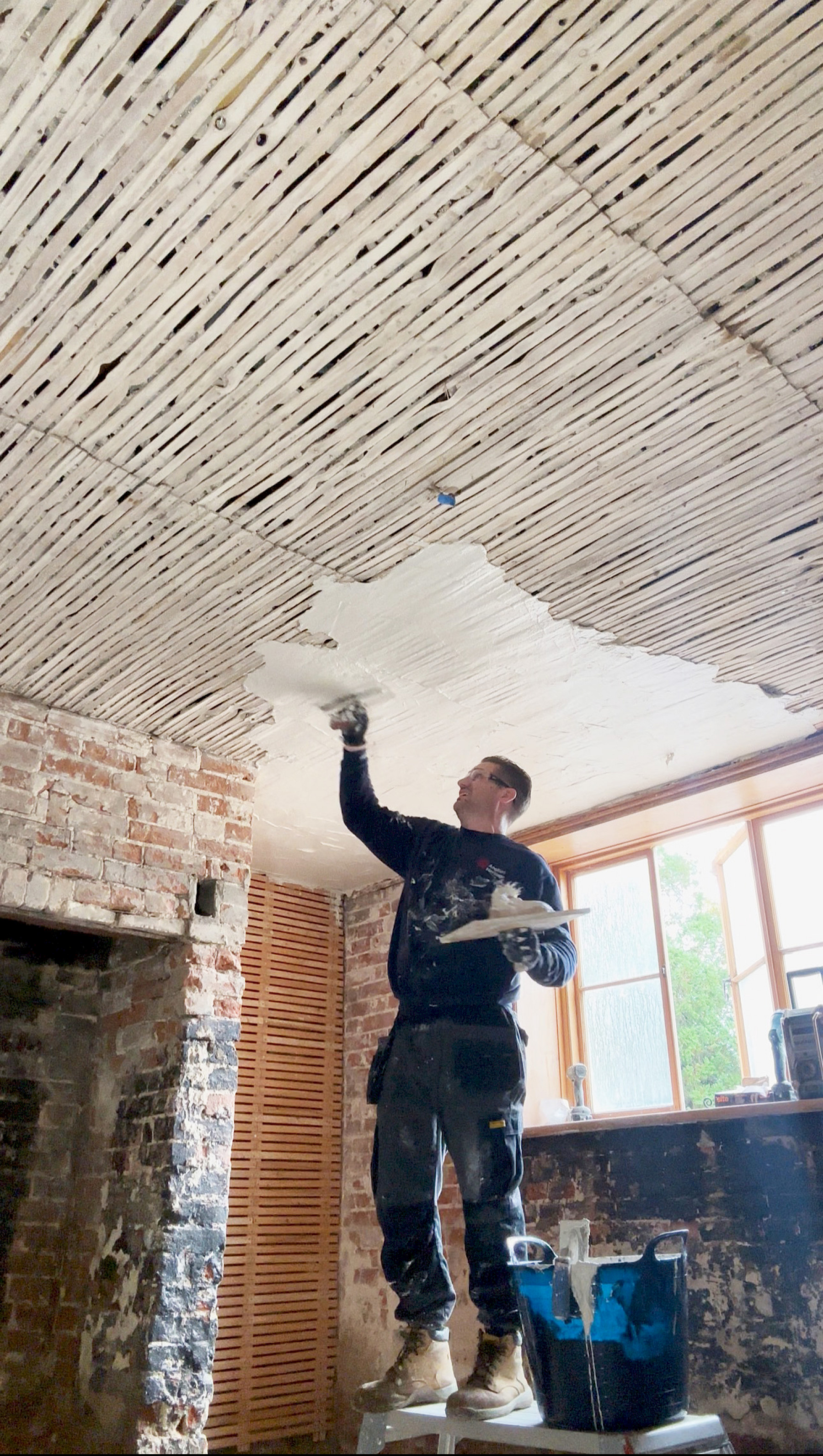 Internal and external lime plastering onto timber frame , wattle & daub, lath, brick, stone, cob block, clunch, savolit board, wood fibre board, plasterwork using breathable and sustainable materials.